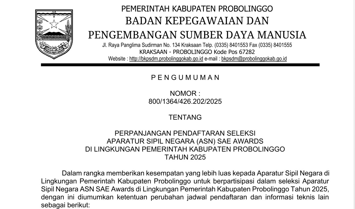 Pengumuman Perpanjangan Pendaftaran Seleksi ASN SAE AWARDS di Lingkungan Pemerintah Kabupaten Probolinggo Tahun 2025